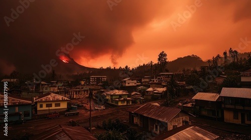 Volcanic eruption looms over small town, red sky.