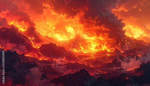 volcano, eruption, fire, lava, mountain, landscape, red, orange, hot, cloud, smoke, misty, huge, epic, dramatic, fiery, burning, chaos, destruction, inferno, molten, earth, nature, sky, darkness, heat, mountain, terrain, volcanic, crater, mountainous, vale, dense, dark, heavy, fierce, crimson, rage, energy, powerful