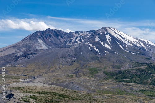 Volcanic landscape of Mount St. Helens National Volcanic Monument, showing the rugged terrain and snow-capped peak. Dramatic geological formations. , Washington, USA