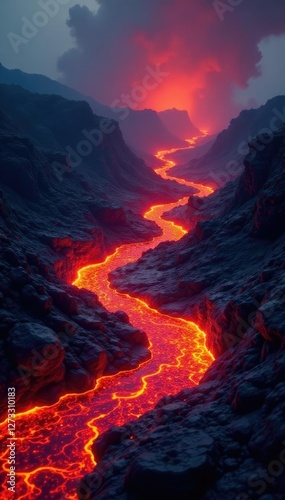 Volcanic lava flow with intense heat and light, glowing, natural wonder