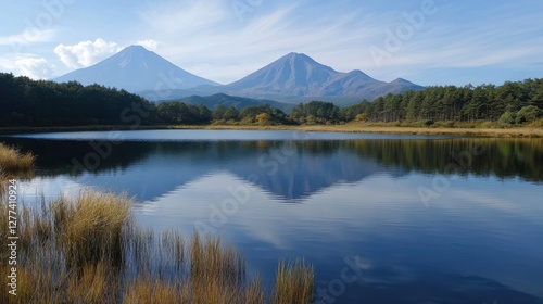 Volcanic peaks reflected in a calm lake surrounded by trees