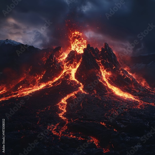 Volcano Eruption with Flowing Lava and Dramatic Sky at Nighttime - Capturing the Power of Nature, Geothermal Activity, and Atmospheric Conditions in a Rugged Terrain