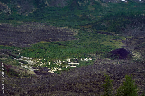 Volcano surrounded by marshland. View from above.