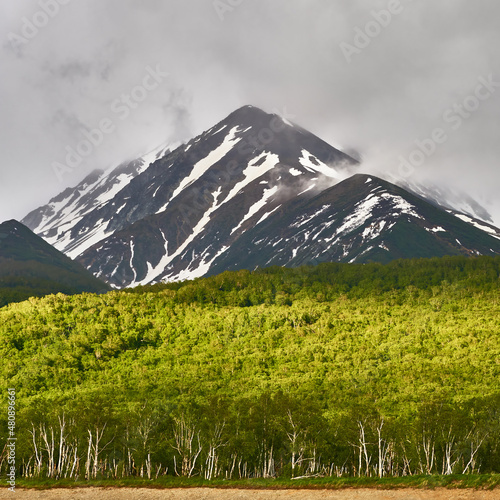 Volcanoes of Kamchatka and mountains against the backdrop of a beautiful forest. Kamchatka Peninsula, Russia. Travel and tourism in the natural park