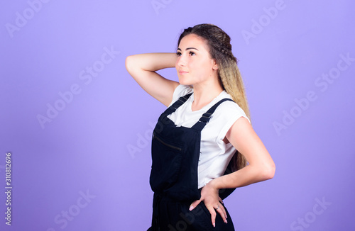 Voluminous crimped hair. Popular look. Trendy crimped hairstyles. Hair crimping method styling hair becomes wavy zigzag fashion. Woman dreamy face posing with stylish hairstyle on violet background
