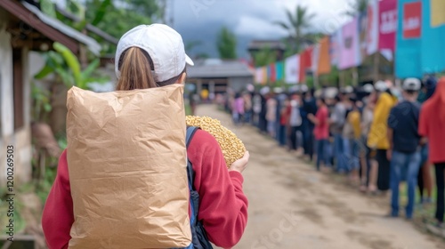 Volunteers distributing food packages to a long line of people, capturing a mix of gratitude and urgency