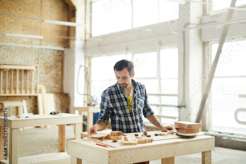 Waist up portrait of mature carpenter working with wood in workshop, copy space
