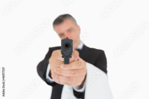 Waiter holding gun directly ahead