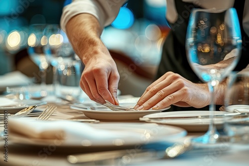 fine dining, eatery, table setting, preparation, waiter, service, luxury, upscale, dining, elegance, silverware, hospitality, arranging, gastronomy, service industry, professional, glassware, cutlery, plate, preparing, dining table, place setting, tableware, refined, meticulous