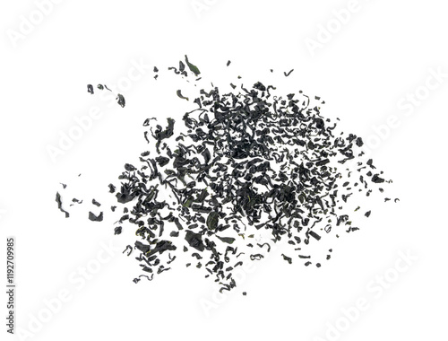 Wakame seaweed pieces isolated, edible raw algae, dry undaria pinnatifida healthy food kelp