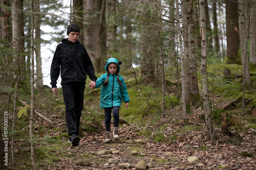 Walking through a tranquil forest path during early spring, a young boy holds hands with a girl dressed in a bright jacket as they explore nature together