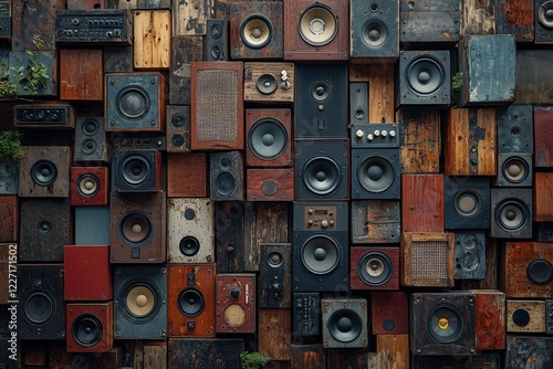 Wall-mounted music speakers in a retro vintage look, paired with modern stacked sound systems