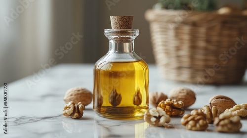 Walnut Oil in a Glass Bottle on a Marble Surface with Walnuts Surrounding It