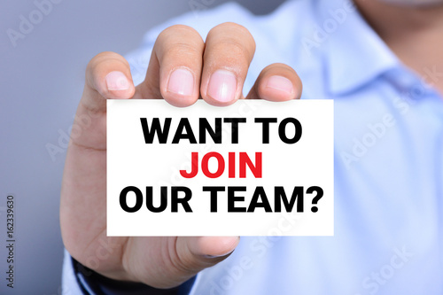 WANT TO JOIN OUR TEAM? message on the card shown by a man