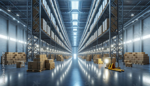 warehouse, interior, roomy, high, shelf, stocked, cardboard, box, aisle, perspective, ground, level, bright, light, source, exit, window, forklift, parked, operator, floor, reflect, overhead, light, polished, logistic, storage, solution, inventory, management, industrial, space, organised, neat, tidy, large, facility, commercial, business, supply, chain, distribution, equipment, transportation