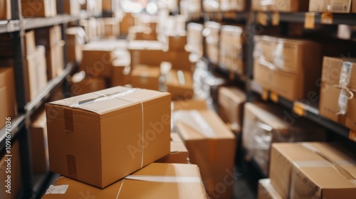 Warehouse with stacked cardboard boxes on shelves