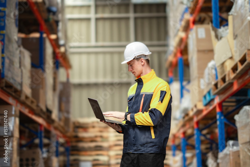 Warehouse worker stands in the aisle using a laptop, checking inventory on high storage shelves with focused expression. Logistic industry with technology.