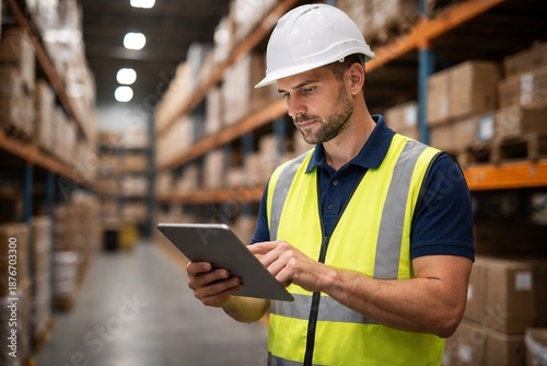 warehouse, men at work, tablet, logistic, inventory, management, distribution, center, industrial, workplace, safety, vest, hard hat, man, adult, male, technology, business, operation, e-business, shipping, receiving, storage, facility, employee, labor, industry, commercial, transportation, delivery, retail, fulfillment, manufacturing, production, efficiency, organisation, planning, coordination, execution, solution