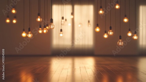 Warm ambient lights hanging in a serene room with a soft glow illuminating the wooden floor.