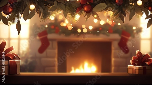 Warm and cozy Christmas fireplace adorned with decorations, presents, and festive lights, evoking a joyful holiday atmosphere.