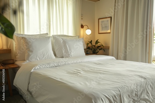 Warm and inviting bedroom setting with crisp white bedding and soft natural light streaming through sheer curtains