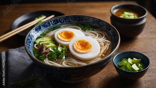 Warm Bowl of Pho with Soft Boiled Eggs and Chopsticks