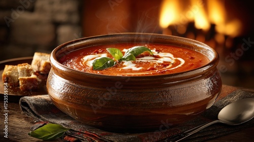 Warm bowl of soup with cream and fresh basil by a cozy fireplace