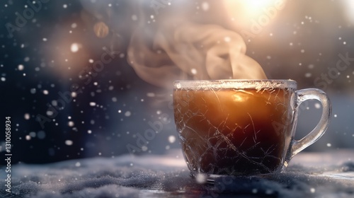 Warm cup of coffee emits steam in a snowy outdoor setting during winter morning light