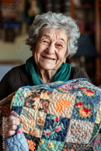 Warm elderly woman holding a handmade quilt with a smile