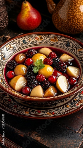 compote, fruit, pear, blackberry, cranberry, autumn, rustic, bowl, warm, spiced, delicious, dessert, food, photo, culinary, gastronomy, still life, autumn, seasonal, receipe, cooking, sweet, juicy, mint, red, yellow, dark, rich, vibrant, flavorful, elegant, romantic, cosy, winter, holiday, healthy, organic, fresh, market, epicure
