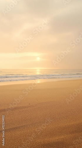 Warm golden sand stretches along the shoreline as sunlight casts a serene glow on the vast expanse of water, light, sea, beach