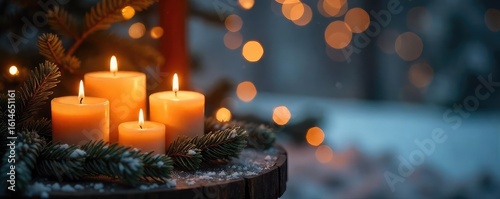 Warm, inviting glow of pine-scented candles illuminating a cozy winter scene Perfect for holiday, hygge, and nature-themed projects , glow, night, rustic