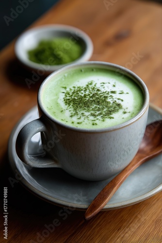 matcha, latte, ceramic, mug, green, tea, powder, warm, beverage, wooden, tabletop, cup, hot, drink, caffeine, frothy, morning, cosy, aromatic, creamy, spoon, saucer, asian, cookery, antioxidant, health, traditional, refreshing, soothing, energy, sharpened, relaxation, afternoon, ritual, smooth, delicate, foam, brown, greenish, organic, japanese, comfort, calming, steaming, artisanal, modern, stylish