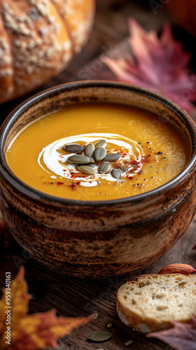 Warm Pumpkin Soup in a Rustic Bowl With Seeds and Autumn Leaves