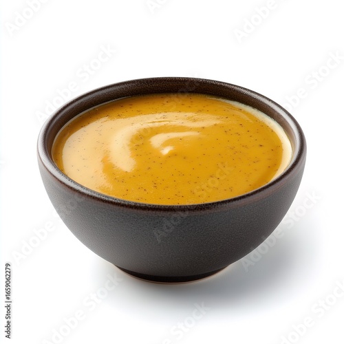 Warm pumpkin soup in black bowl with creamy texture