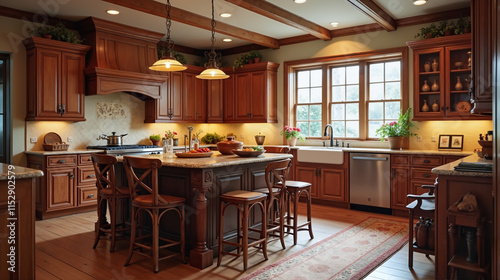 kitchen, rustic, elegant, warm, wooden, cabinet, island, countertop, appliance, window, natural light, cosy, roomy, traditional, home, interior, design, decor, cooking, dining, family, gathering, comfortable, inviting, homelike, country, classic, timeless, autumn, thanksgiving, christmas, harvest, entertaining, epicure, culinary, renovation, remodel, luxury, high-end, custom, craftsman, woodwork, cabinetry, granite, hardwood, floor, beam