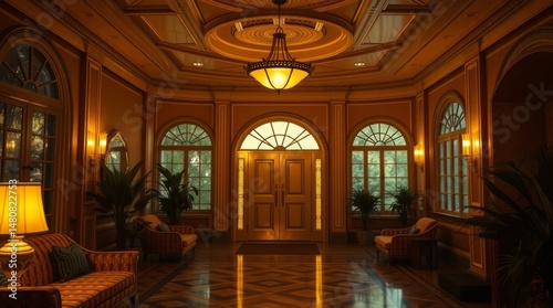 Warm, soft-lit image of an art deco house interior. high-quality, professional photography. focus on radiant, luxurious details. golden hour lighting, soft contrast. editorial photography style.