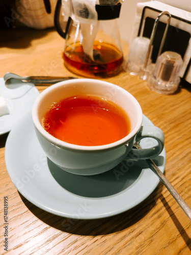 Warm tea served in a light blue cup on a wooden table during a cozy cafe visit