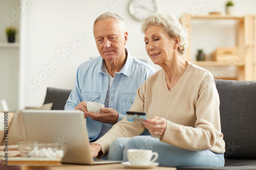 Warm toned portrait of modern senior couple shopping online or paying taxes holding credit card while using laptop at home, copy space
