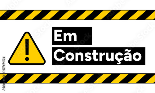 Warning sign with “Em construção” text in Portuguese. Caution stripes and Exclamation mark symbol. Under construction. Construction, repair, update zone concept. Vector illustration.
