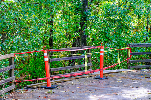 Warning Tape on Broken Railing of a Raised Wooden Walking Trail
