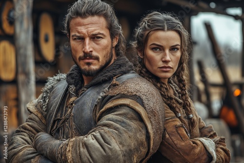 warrior, village, ancient, rustic, morning, cold, clothing, heritage, confidence, landscape, mediaeval, partnership, armoring, strong, braid, man, woman, teamwork, history, adventure, strength, culture, winter, friendship, character, portrait, brave, tradition, standing, together, two-story, expression, determination, engaged, fighter, survival, scene, outdoors
