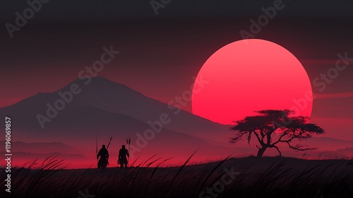 warrior, sunset, silhouette, landscape, design, game, red, sun, mountain, background, art, image, graphic, illustration, digital, fantasy, adventure, nature, scenery, horizon, sky, night, dusk, field, tree, africa, asia, japan, ancient, mythology, epic, dramatic, power, strength, mystery, solitude, journey, travel, exploration, mood, atmosphere, peaceful, serene, calm, dark