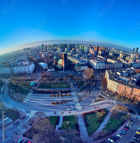 WARSAW, POLAND - NOVEMBER 27, 2018: Beautiful panoramic aerial drone view to the center of Warsaw City and Roman Catholic Parish of St. James the Apostle at Narutowicza Square, Ochota district