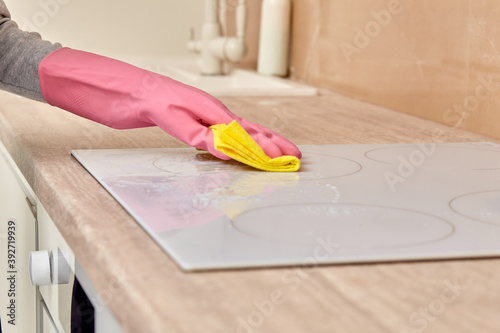 Wash the surface of the electric cooker with rubber gloves and microfiber. Home routine. Professional cleaning.