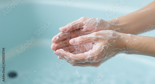 Washing hands with soap creating bubbles and droplets, conveying a sense of cleanliness and care, highlighting personal hygiene in a serene bathroom setting with soft blue tones