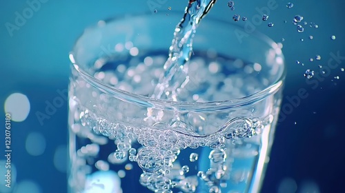 Water being poured into a glass, close-up of water and bubbles in the air, glass on a blue background