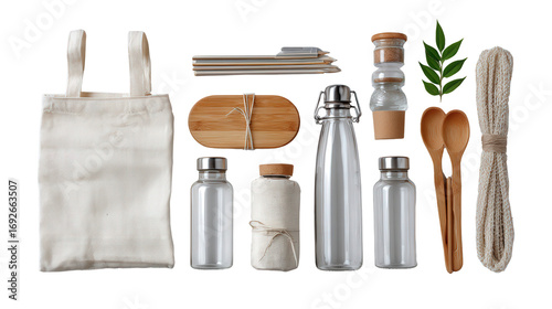 Water Bottles and Eco Products: A flat lay of water bottles and eco-friendly products like reusable bags and straws, isolated on a Transparent background, PNG file.
