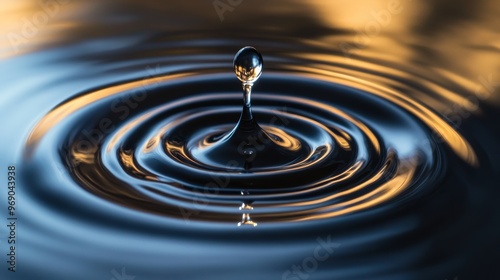 Water droplet creating ripples, close-up reflection. Nature and tranquility concept