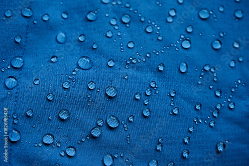 Water drops on waterproof membrane fabric. Detail view of texture of blue waterproof cloth.